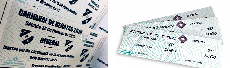 Rosario Entradas, la linea de tickets entrada de Rosario Pulseras son una forma novedosa y efectiva para el control de acceso a eventos. A partir de diferentes medidas de seguridad, facilitan el registro en los ingresos e inhiben la posibilidad de ser falsificados. Los patrones y terminaciones incluyen troquelados, hologramas, numeración y tintas UV, para dar absoluta tranquilidad. Nosotros realizamos la impresión personalizada de Tickets para todo tipo de eventos, en tiempos acotados (Envíos Express), y a todo el país, otorgándole una mayor calidad de tu fiesta o evento.